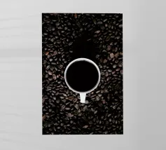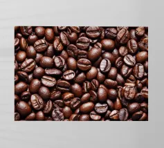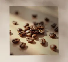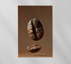 I chicchi di caffè marrone sono sospesi in aria sopra una superficie lucida che riflette una pozza scura di caffè preparato, creando un'atmosfera drammatica e accattivante.