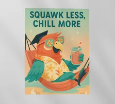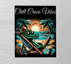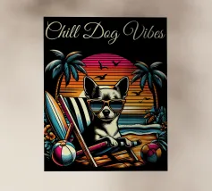 Un capibara rilassato con gli occhiali da sole si sdraia su una spiaggia con un drink tropicale e un vibrante tramonto sullo sfondo. La frase "Chill Vibes Only" è ben visibile accanto al capibara.