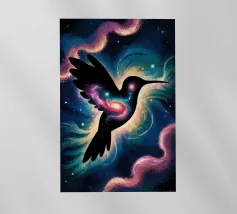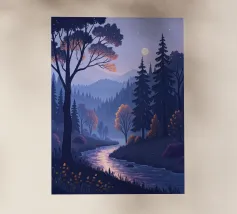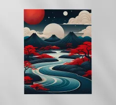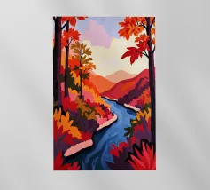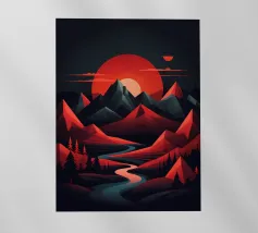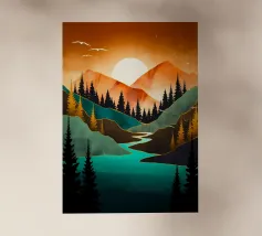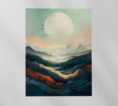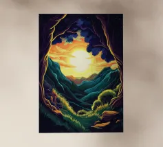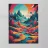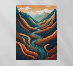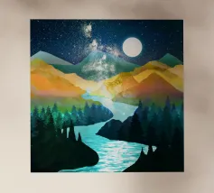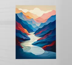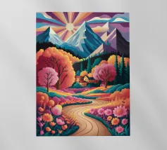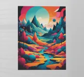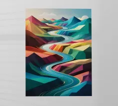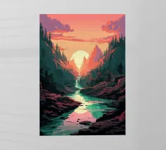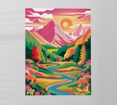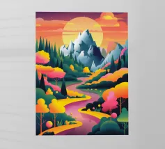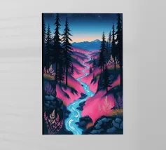 Si apre un paesaggio ipnotico, dove cime imponenti trafiggono un cielo pieno di sfere di luce. La scena è un tripudio di colori, con sfumature di arancio, rosa, blu e viola che si fondono senza soluzione di continuità. L'uso di linee spigolose e taglienti accostate a forme morbide e arrotondate crea una tensione visiva accattivante. Un fiume tranquillo si snoda nella valle, riflettendo i colori vibranti che la sovrastano. Quest'opera invita lo spettatore a esplorare un mondo in cui colore e forma danzano in perfetta armonia.