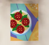 Con una ciotola piena di fette di pomodoro rosso fresco e foglie verdi, questo design luminoso e minimalista รจ perfetto per un tema alimentare sano.