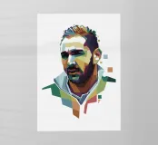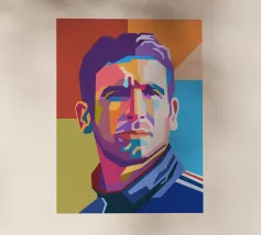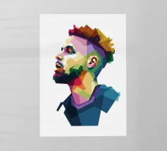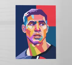 Coco in stile WPAP è un ritratto geometrico audace e colorato del famoso calciatore francese. Utilizzando tinte vivaci e forme spigolose, l'opera d'arte WPAP (Wedha's Pop Art Portrait) cattura la calma determinazione e il look iconico di Coco, riflettendo la sua eleganza, forza e abilità sul campo da calcio.