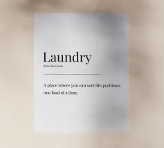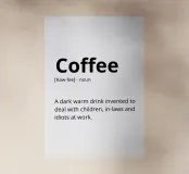 Una definizione umoristica del caffè lo descrive come un rimedio necessario per affrontare le sfide quotidiane come i figli, i suoceri e i colleghi. Il testo imita scherzosamente una voce del dizionario con l'ortografia fonetica e la parte del discorso.