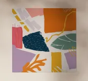 Un collage astratto di forme frantumate e sovrapposte in una vibrante tavolozza di arancione, blu e rosa crea una composizione dinamica, energica e moderna.