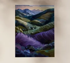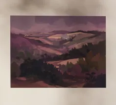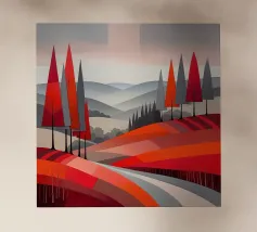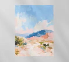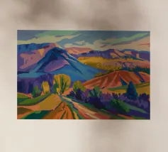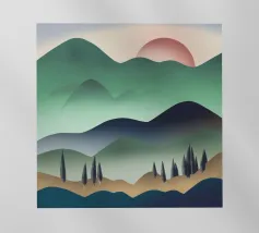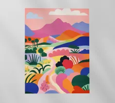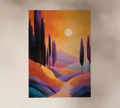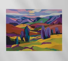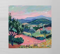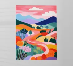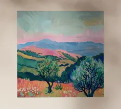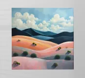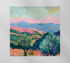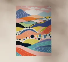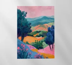 Morbide colline ondulate mostrano ricche sfumature di rosa, arancione e blu, mentre un cielo vibrante pieno di soffici nuvole esalta l'atmosfera tranquilla. Piccoli alberi punteggiano il paesaggio.
