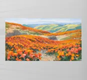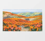 Le colline ondulate si infiammano dei colori arancio e rosso fuoco del fogliame autunnale, creando un paesaggio vibrante, ampio e caldo che celebra la bellezza della stagione.