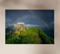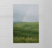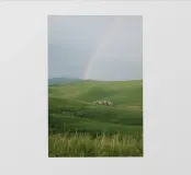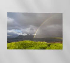 Colline verdi con arcobaleno e rocce pellicola backlit