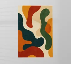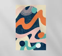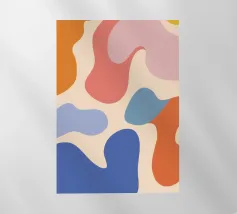 Un'opera d'arte astratta dinamica che presenta una collisione di forme organiche e audaci in colori vivaci come l'arancione, il rosa e l'azzurro intenso. La composizione è energica e moderna e rappresenta una forte dichiarazione visiva.
