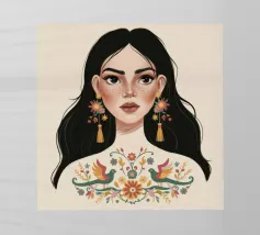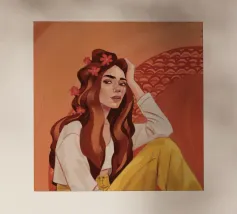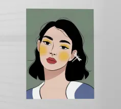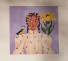 Questo dipinto ritrae una persona che indossa una camicia a righe gialle e bianche con grandi orecchini arancioni. Un piccolo uccello è appollaiato sulla spalla della persona, aggiungendo un elemento affascinante alla composizione.