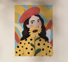Questo dipinto ritrae una persona che indossa una camicia a righe gialle e bianche con grandi orecchini arancioni. Un piccolo uccello è appollaiato sulla spalla della persona, aggiungendo un elemento affascinante alla composizione.