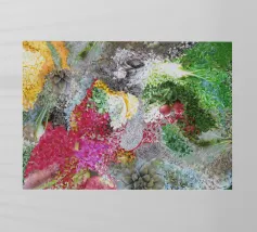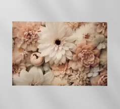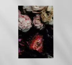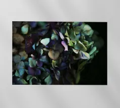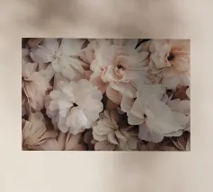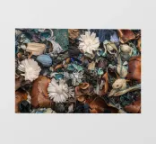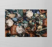 Quest'opera d'arte presenta una composizione di piante secche ed elementi floreali disposti ad arte che combinano naturalezza ed estetica. Tre fiori bianchi sono al centro della scena, la loro forma elegante e la loro consistenza fine ricordano la porcellana. Appaiono come protagonisti silenziosi in un ricco insieme di materiali essiccati, tra cui foglie delicate, teste di semi e capsule di frutta nelle calde tonalità del marrone, del verde e del blu.