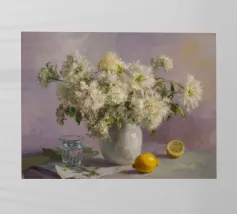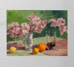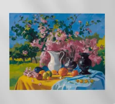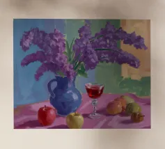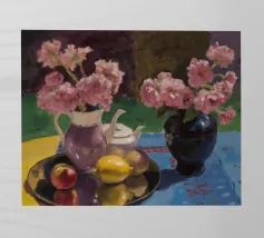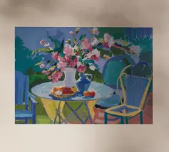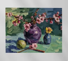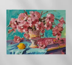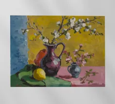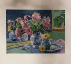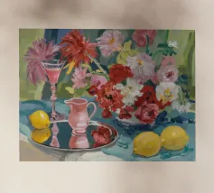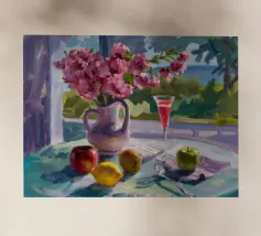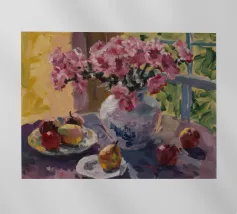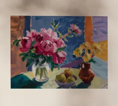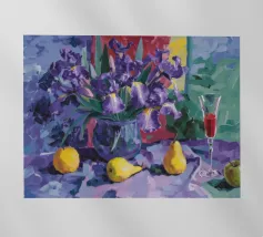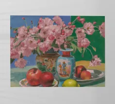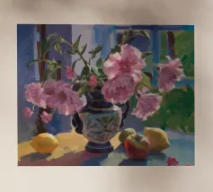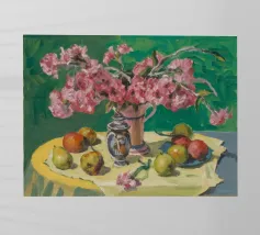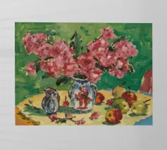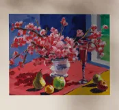 Un'audace natura morta con vivaci fiori rosso-rosa, forse papaveri o gerani, in un semplice vaso, accanto a fresche pere verdi, il tutto su una ricca tovaglia rossa che contrasta nettamente con uno sfondo blu intenso.