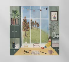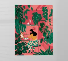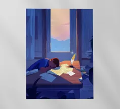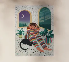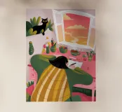 Questo dipinto raffigura una persona seduta a una scrivania con varie piante e materiale artistico. La persona indossa una camicia a quadri gialla e sembra essere profondamente pensierosa, guardando fuori dalla finestra un tramonto colorato. Un gatto nero è appollaiato sul davanzale, aggiungendo un tocco di bizzarria alla scena.