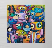 Esseri fantasiosi ed elementi fantastici si uniscono in una composizione vibrante. Questo dipinto invita gli spettatori a esplorare un mondo magico dove la creatività non conosce limiti.