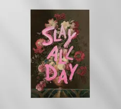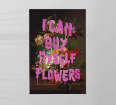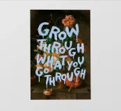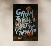 Questo poster combina una vecchia natura morta floreale con una citazione motivazionale. Colori pastello tenui e toni ricchi mostrano un bouquet di fiori sovrapposto alla scritta "Grow Through What You Go Through" in blu brillante.
