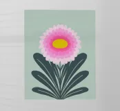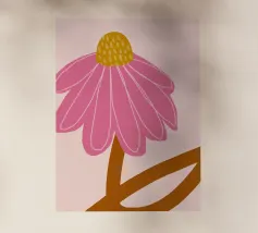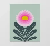 Brighten up your space with this vibrant chrysanthemum illustration, showcasing layers of pink scalloped petals radiating from a cheerful yellow center. Framed by bold, dark green leaves, the flower pops beautifully against a soft pastel green background, creating a harmonious and uplifting design. This artwork exudes a modern yet timeless botanical charm, perfect for nature lovers and flower enthusiasts alike.