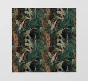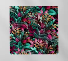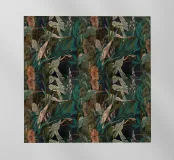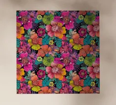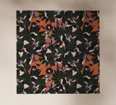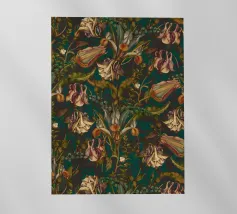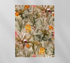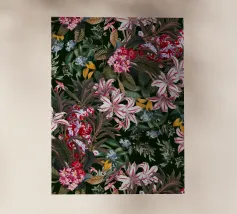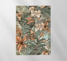 Un lussureggiante motivo botanico vintage con fiori e foglie tropicali di colore verde acqua, arancione, verde oliva e crema su uno sfondo scuro. Questo disegno ispirato alla giungla ha una qualità di illustrazione vintage con elementi botanici dettagliati e toni terrosi. Perfetto per gli amanti delle botaniche scure, per gli appassionati del vintage tropicale, per i fan dell'estetica umorale e per tutti coloro che apprezzano i fiori ricchi e sofisticati con un'atmosfera misteriosa da giardino esotico.