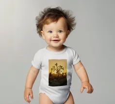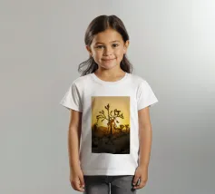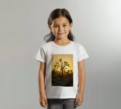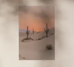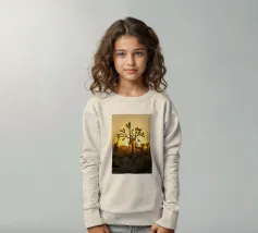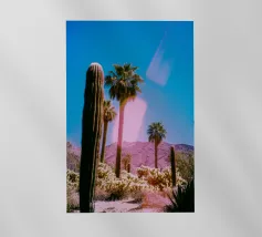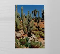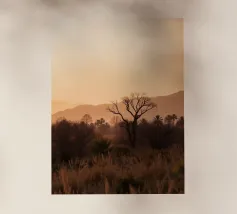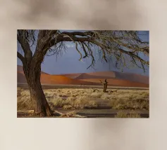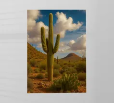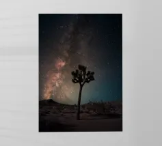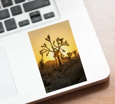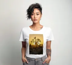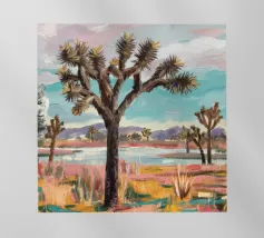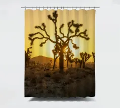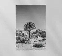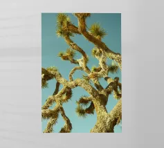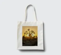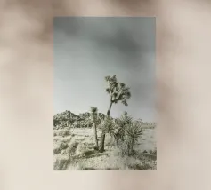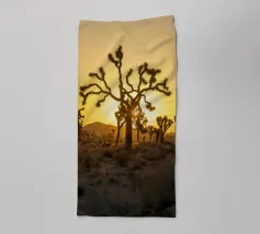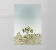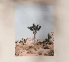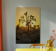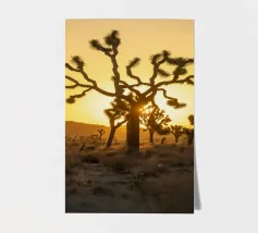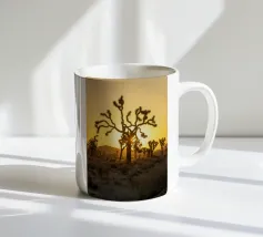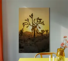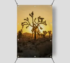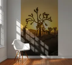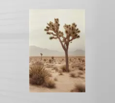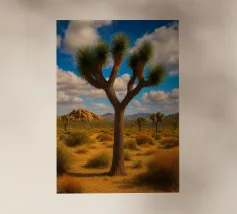 Alti alberi di Joshua si ergono dal terreno sabbioso, i loro rami contorti si protendono in tutte le direzioni come giganteschi candelabri. La terra secca è disseminata di rocce, arbusti resistenti e macchie di sabbia dorata. In lontananza, le basse montagne brillano nel calore. L'aria è calda e secca, pervasa dalla quiete del paesaggio aperto.