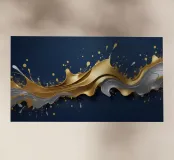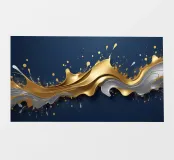 Una composizione astratta che mostra onde dinamiche di oro e argento, intrecciate con spruzzi vibranti su uno sfondo blu profondo, ideale per sfondi desktop e sfondi artistici.