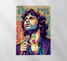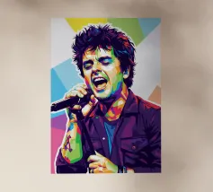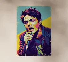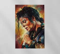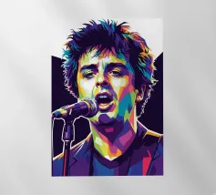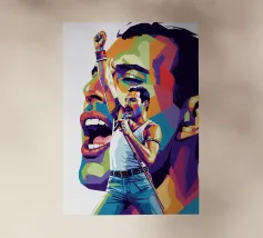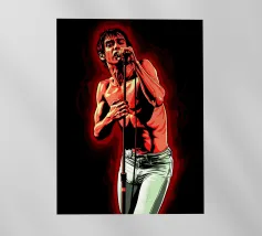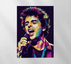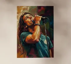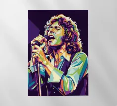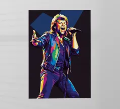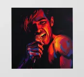 Una rappresentazione dinamica e colorata di un cantante maschile che canta appassionatamente in un microfono. L'intensa illuminazione del palco mette in risalto i suoi tratti espressivi e il suo fisico muscoloso.