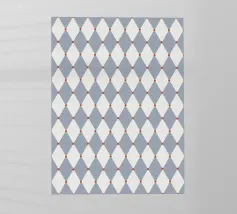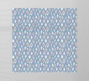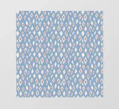 Un motivo ripetuto presenta rombi di colore rosa tenue e bianco su uno sfondo azzurro, creando un disegno geometrico. La disposizione delle forme conferisce un senso di ritmo e armonia.