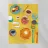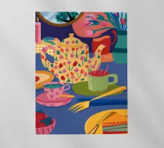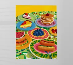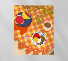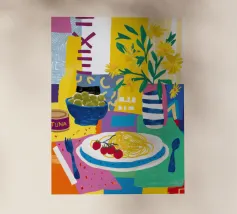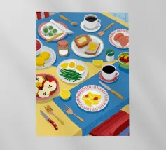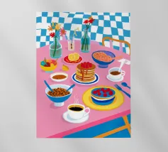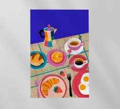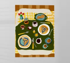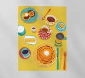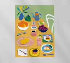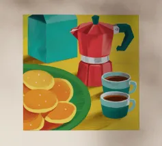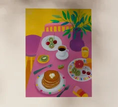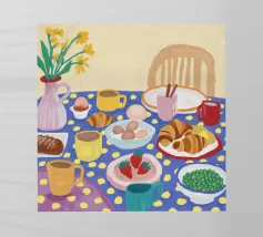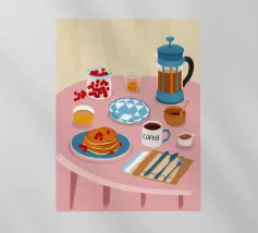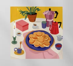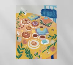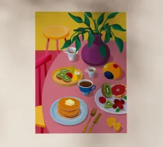 Illustrazione luminosa e allegra di un tavolo per la colazione illuminato dal sole, con caffè, succo d'arancia e pasticcini su un vivace sfondo giallo.
