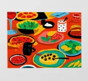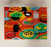 Una vibrante vista dall'alto di un banchetto di cibo festivo, con un gatto in mezzo a vari piatti come anguria, tacos e insalate. La scena è caotica, colorata e gioiosa.