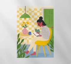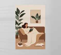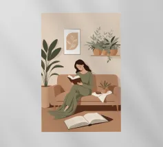 Una donna si accoccola su un divano verde, immersa in un libro e con una tazza di tè vicino. La stanza è decorata con piante e opere d'arte, creando una scena perfetta di confortevole solitudine e fuga intellettuale.
