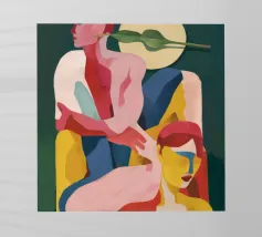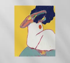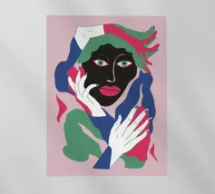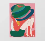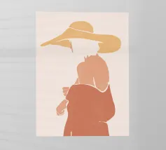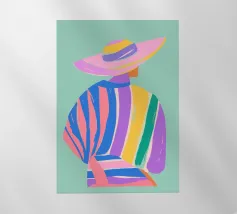 Un ritratto astratto di una donna il cui volto è oscurato da un grande cappello verde e da abiti colorati, che creano un'aura di mistero e intrigo elegante.