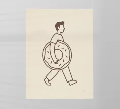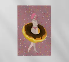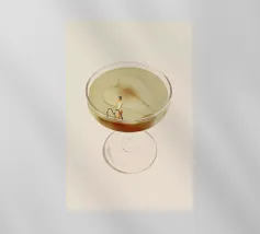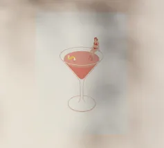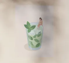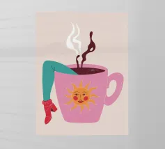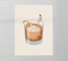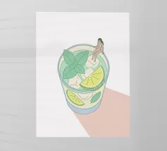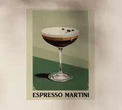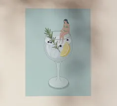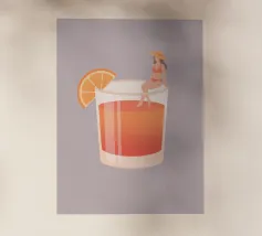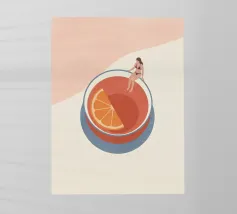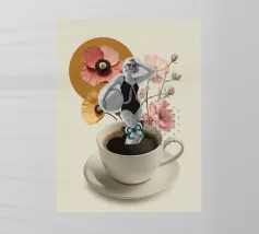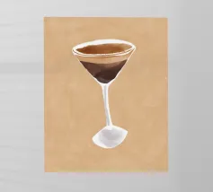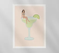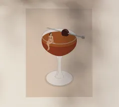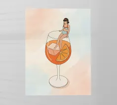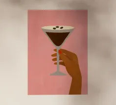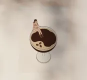 Illustrazione originale di una donna in miniatura in costume da bagno che immerge le gambe in un bicchiere di Espresso Martini. La superficie nera e spumosa del cocktail mette in risalto i chicchi di caffè galleggianti, creando un'atmosfera chic, energica ed estiva. Questa scena poetica fonde il mondo del caffè con quello delle vacanze. Perfetta per un bar, una caffetteria o un'area relax dall'estetica contemporanea.