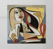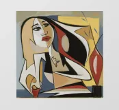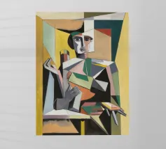 Quest'opera d'arte presenta una figura astratta in una posa dinamica, circondata da forme e colori audaci. La composizione crea un senso di movimento ed energia.
