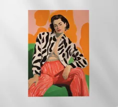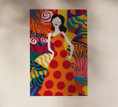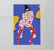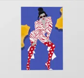 A high fashion illustration of a figure in a confident, dynamic pose, showcasing a bold clash of patterns with a geometric jacket and red polka dot pants, exuding pure energy.