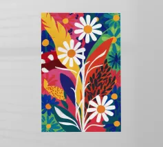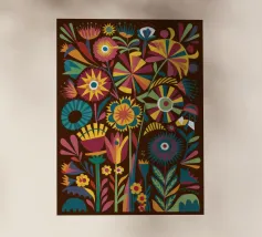 Un vivace patchwork di motivi e fantasie diverse, che combina elementi floreali, forme astratte e disegni di piastrelle. L'eclettico mix di colori e stili crea una composizione visivamente ricca e gioiosa, che ricorda una parete di piastrelle del Mediterraneo.