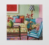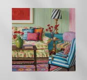 A vibrant, eclectic parlor filled with a mix of patterns and colors. A floral sofa, a striped armchair, and patterned wallpaper create a maximalist's dream, full of personality and creative energy.
