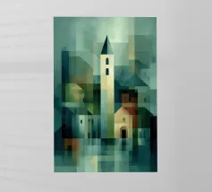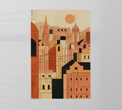 Paesaggio urbano stilizzato in una resa piatta e astratta, caratterizzata da forme geometriche ed elementi grafici audaci. La composizione minimalista utilizza i toni tenui del grigio, dell'arancione, del beige e del blu e combina influenze cubiste con linee pulite e motivi simmetrici su uno sfondo bianco, creando un design elegante e moderno. Gli elementi sono stati realizzati a partire da schizzi in Adobe Illustrator e poi combinati in Photoshop.