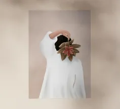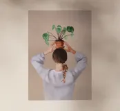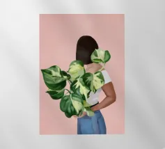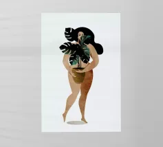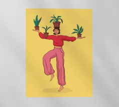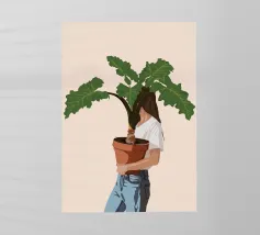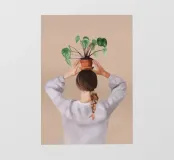 Un ritratto affascinante e dai toni tenui di una donna che tiene in equilibrio una pianta in vaso sulla testa, vista da dietro. Con la sua treccia infilata sotto un maglione accogliente e su uno sfondo neutro e caldo, questa illustrazione celebra l'armonia, la consapevolezza e un tocco di estrosità quotidiana. Un'opera d'arte da parete perfetta per gli amanti delle piante, per gli spazi dedicati allo yoga o per gli interni calmi e creativi.