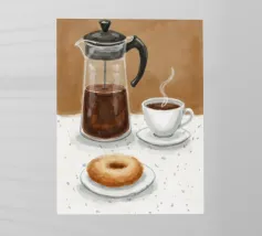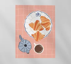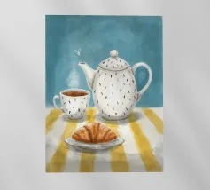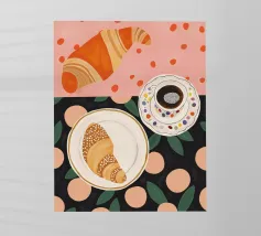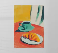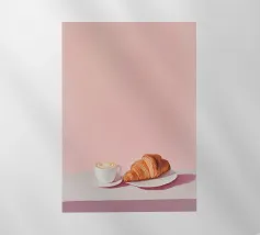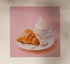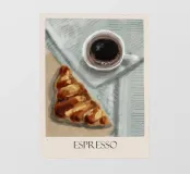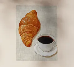 Una scena calda e invitante con una ricca tazza di caffè espresso posta elegantemente su un tavolo di legno. Il caffè scuro, ricoperto da un delicato strato di crema, si trova accanto a un croissant sfogliato e dorato, i cui strati di burro scintillano sotto una luce morbida e naturale. La composizione emana un'atmosfera accogliente e mattutina, con sottili riflessi sulla superficie della tazza di caffè e un accenno di vapore che sale dall'espresso. Lo sfondo è sfocato e si concentra sulla consistenza e sul calore del caffè e del pasticcino, invitando lo spettatore a concedersi un momento di tranquillo lusso.