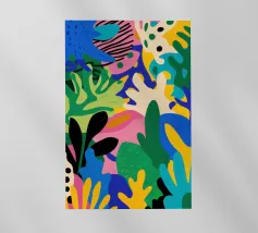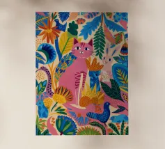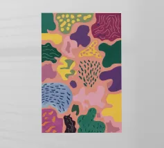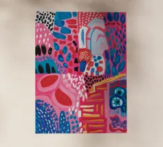 Una composizione astratta vivace e giocosa, caratterizzata da una serie di forme organiche simili a blob in blu, rosa e giallo. Le forme spontanee e i colori energici creano un senso di gioiosa espressione artistica.