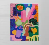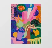 Una composizione astratta vivace e giocosa, caratterizzata da una serie di forme organiche simili a blob in blu, rosa e giallo. Le forme spontanee e i colori energici creano un senso di gioiosa espressione artistica.