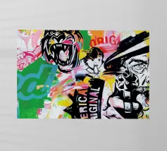 Le opere di Josh Ruggs guardano in modo satirico al sogno americano e a tutti i discorsi sociali, politici e culturali che vi ruotano attorno. Utilizza oggetti familiari di uso quotidiano, celebrità ed estetica comica, chiaramente nella tradizione della Pop Art, come strumenti per visualizzare queste narrazioni della cultura di massa, del consumo e del culto della personalità. Per creare le sue immagini multistrato, l'americano lavora con spray, pittura acrilica, olio, inchiostro e praticamente con ogni superficie che gli capiti sotto mano.