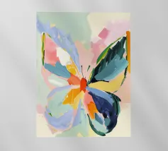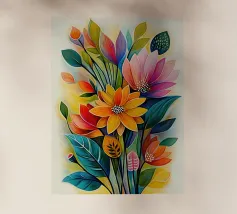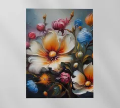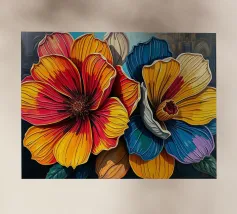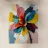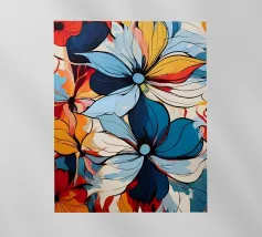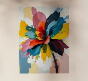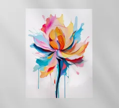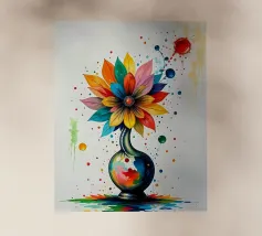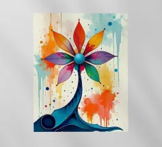 Questo vibrante dipinto astratto presenta un dinamico fiore a più petali che esplode in una gamma di colori audaci, tra cui blu profondi, rossi ricchi, gialli brillanti, arancioni energici e rosa tenui. Le pennellate sono sciolte ed espressive, con texture visibili e schizzi di colore che creano un senso di movimento e spontaneità. Uno stelo scuro, quasi sagomato, fa da sfondo alla caleidoscopica esplosione di colori, mentre le sfumature di bianco e i toni tenui dello sfondo permettono alle tonalità vivaci di risaltare. L'impressione generale è quella di un'energia gioiosa e di una bellezza floreale astratta.