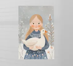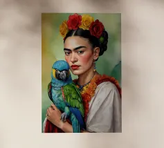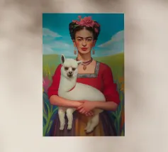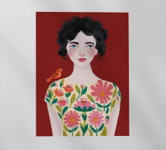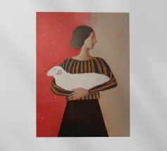 Questa opera d'arte mostra una persona con un maglione rosso che tiene in mano un gallo. Lo sfondo è scuro e mette in risalto gli elementi rustici e affascinanti della scena.