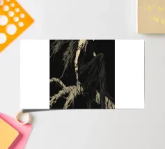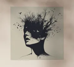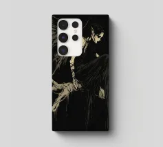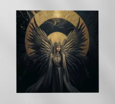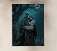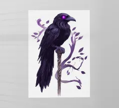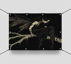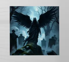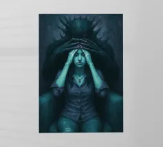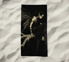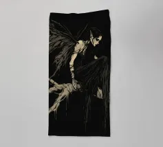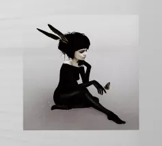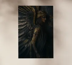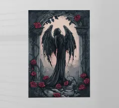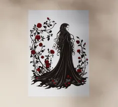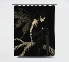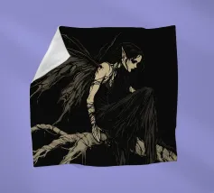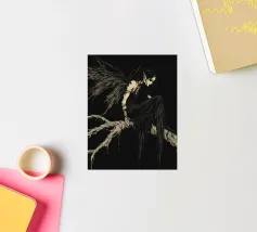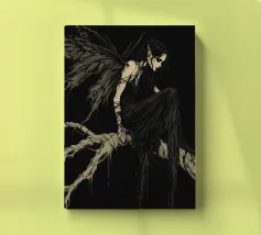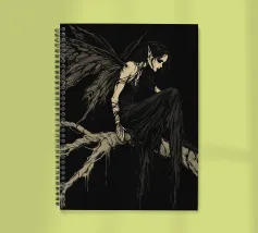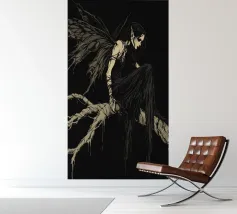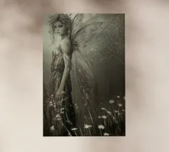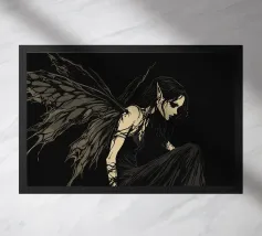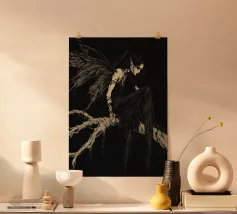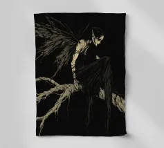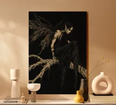 Una fata malinconica vestita di nero siede su un ramo nodoso e dall'aspetto antico. I lunghi capelli le ricadono sulle spalle e lo sguardo è abbassato dalla malinconia. Le ali strappate e trasparenti, che ricordano le foglie appassite, sono particolarmente suggestive. L'intera scena è caratterizzata da colori scuri, con forti contrasti tra le zone chiare della pelle e il nero profondo dello sfondo. L'atmosfera è misteriosa, triste e fiabesca, quasi come un momento di un romanzo dark fantasy.