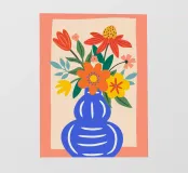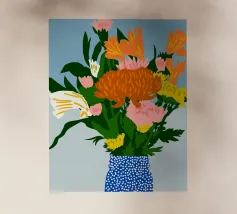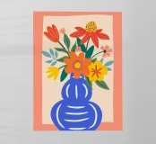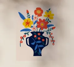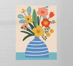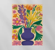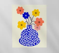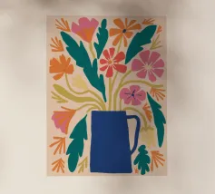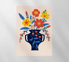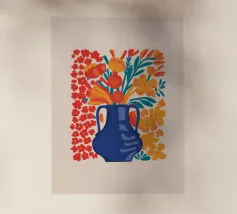 Questo allegro motivo floreale mostra un vaso blu stilizzato pieno di fiori colorati in arancione, rosso, giallo e rosa, incorniciato da una calda tonalità corallo. Il disegno irradia gioia di vivere e armonia ed è perfetto per murales, cuscini, tazze, cover per cellulari e altro ancora. Ideale per chi ama un'estetica fresca e moderna e desidera ravvivare la propria casa con accenti colorati e naturali. Questa composizione floreale senza tempo si adatta a qualsiasi ambiente e a qualsiasi stile di casa.