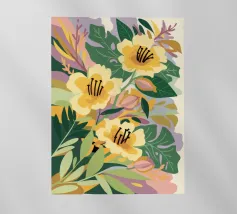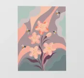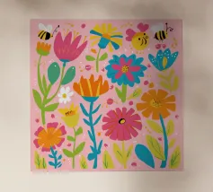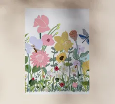 Il disegno dettagliato presenta una varietà di fiori vivaci visitati da api indaffarate.