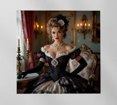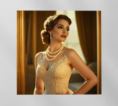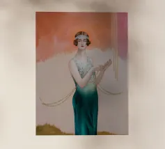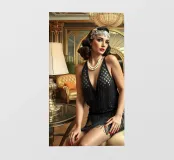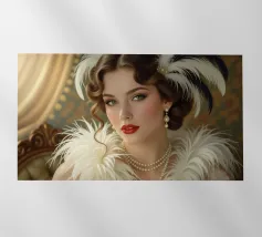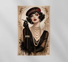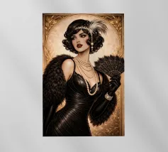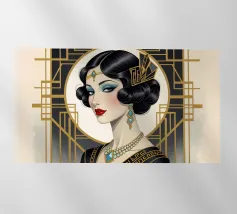 Elegante ragazza flapper nel lusso dell'Art Déco Questa immagine mostra una splendida flapper girl in posa elegante tra opulenti accenti metallici, arredi sontuosi e decorazioni ornamentali, fondendo gli stili futuristico e Art Déco con curve organiche e surrealismo sognante.