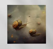 Una composizione surreale con lumache che scivolano senza sforzo in un cielo sognante pieno di nuvole soffici e braci incandescenti sparse. Questa scena stravagante fonde fantasia e natura, creando un'atmosfera unica e magica dal fascino delicato e ultraterreno.