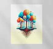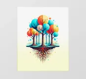 In superficie, un gruppo di alberi stilizzati esplode di colori, con le loro chiome che formano sfere di blu, arancione e giallo vibranti, alcune delle quali sono giocosamente divise in due metà contrastanti. Questo gioioso spettacolo di colori è rispecchiato da un'intricata rete di radici rosso intenso sotto la superficie, che simboleggia la forza nascosta e la connessione fondamentale che sostiene la vita. Le sfere colorate sparse aggiungono un'atmosfera stravagante ed energica, evocando un senso di meraviglia e di crescita. Perfetto per aggiungere un tocco di creatività e armonia naturale a qualsiasi spazio, questo pezzo celebra sia l'individualità che l'unità.
