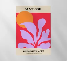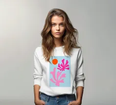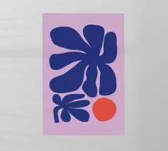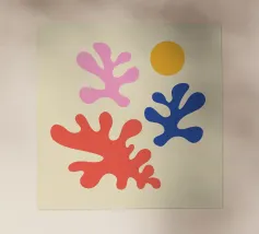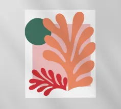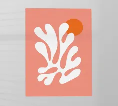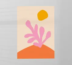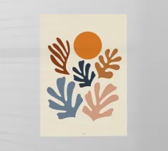 arte botanica astratta, forme moderne di piante, foglie di corallo rosa, illustrazione del sole arancione, sfondo blu pastello, design floreale minimalista, natura astratta contemporanea, grafica fogliare giocosa, opera d'arte dalle forme audaci, stampa ispirata a Matisse, atmosfera moderna tropicale, flora astratta vibrante
