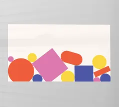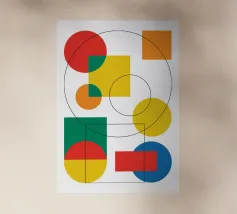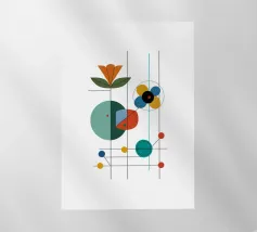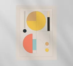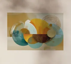 L'opera d'arte presenta una disposizione dinamica di forme geometriche dai colori vivaci. Cerchi, rettangoli e linee si intrecciano, creando un senso di movimento ed equilibrio.