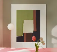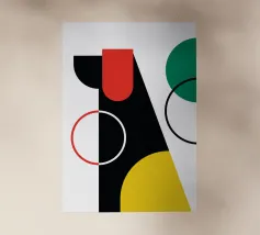Un'audace composizione astratta con forme geometriche nei toni del rosso, del verde acqua, del grigio e del beige. Il design è semplice e moderno e mette in risalto il contrasto di colori.